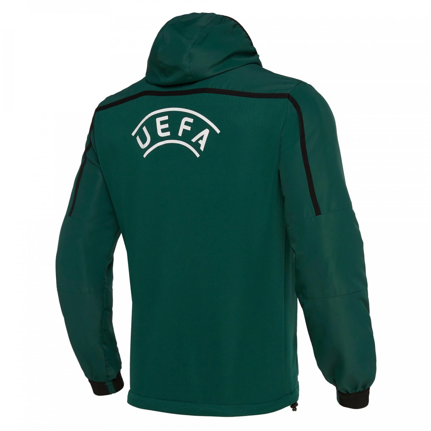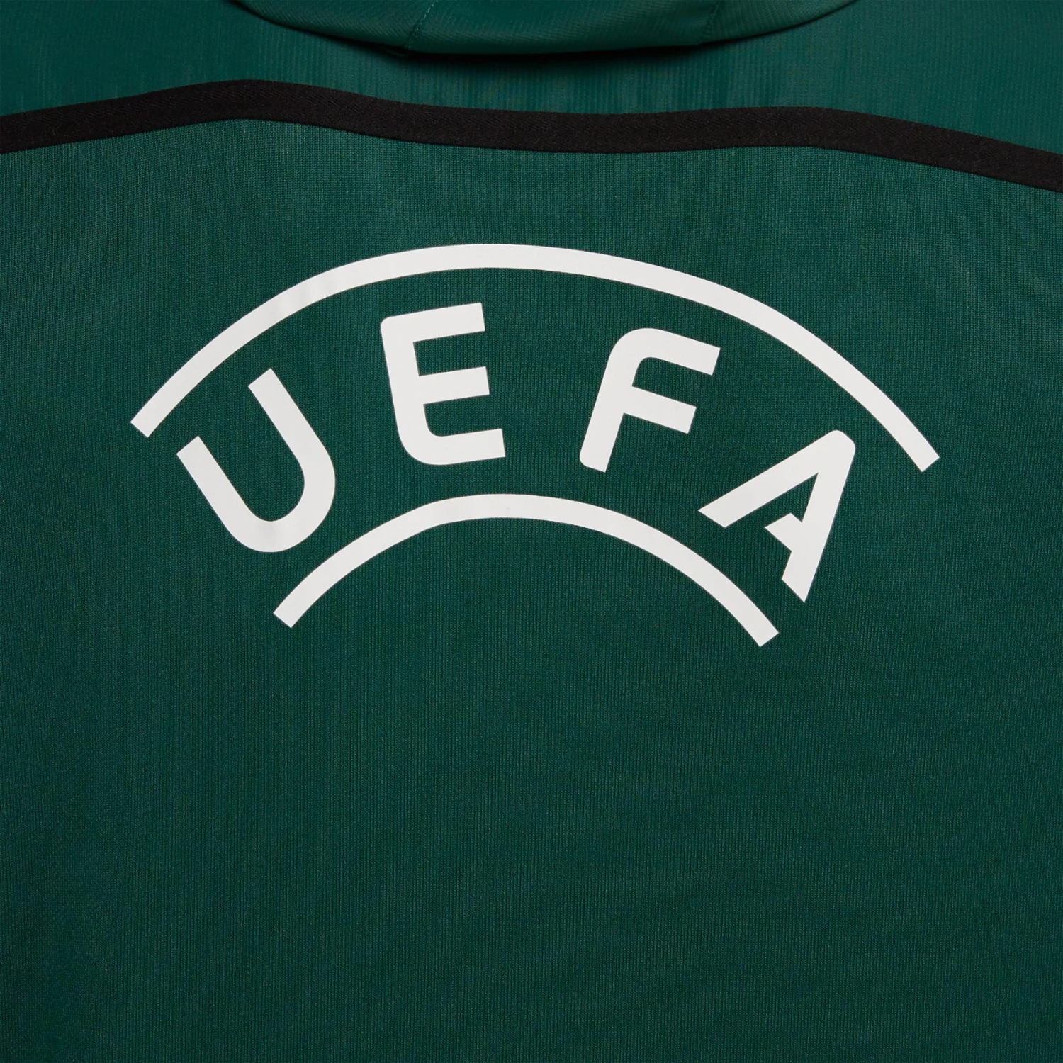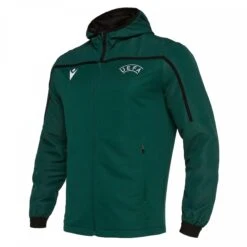 Das Kapuzen-Sweatshirt, das von Macron für die UEFA hergestellt wurde, besteht aus einem polydiagonalen Stoff in Kombination mit Mikrofaser, die speziell für Trainingsbekleidung entwickelt wurde und eine bequeme und elastische Passform bietet. Die Kapuze hingegen hat ein schwarzes Netzfutter. Zwei große Taschen mit Frontverschluss machen das Kleidungsstück sehr bequem. Der Kordelzug an der Unterseite des Sweatshirts sowie die elastischen Bündchen und das schwarze Band, das von Ärmel zu Ärmel verläuft, machen das Sweatshirt sehr angenehm zu tragen.